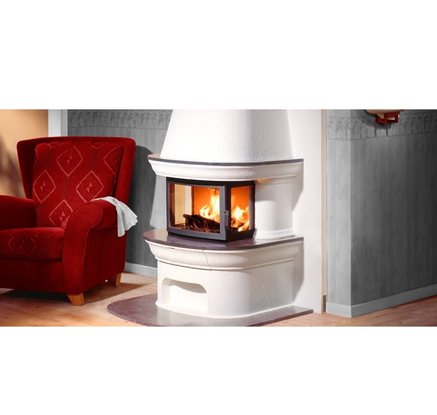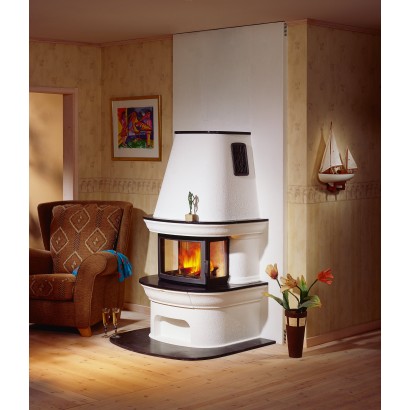 Печь-камин Contura 460 с серым корпусом топки с поворотной колосниковой решеткой, теплонакопительным блоком и выдвижным зольником. Отделка из бетона по индивидуальную покраску, мраморная полка и фриз. Имеется чугунная решетка для выхода горячего воздуха. Элегантность камина подчеркивается мягкими линиями дверцы топки и изящной аркой мраморной каминной полки. Стеклянные боковые стенки топки позволяют видеть пылающий огонь из любой точки комнаты, в то время, как тепло распространяется по всему помещению – согревая тело и душу.