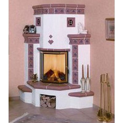 Оригинальным решением этого изразцового камина являются боковые стойки для декоративных предметов интерьера. Призматическая дверца топки с жаропрочным стеклом. Внизу камина расположена дровница.