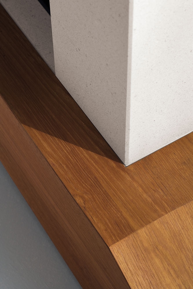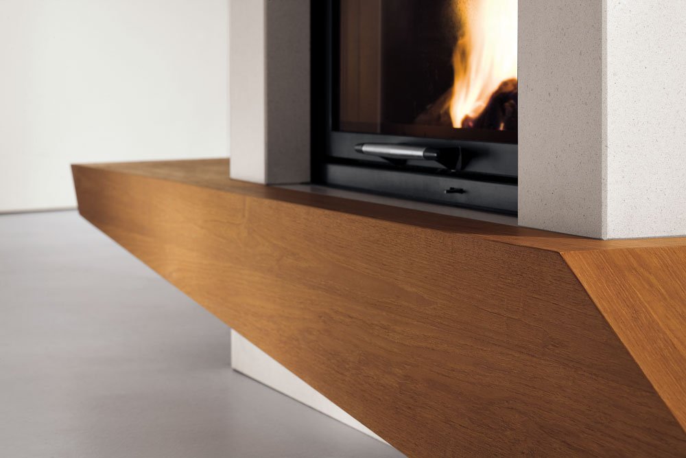 Центральный камин, изготовлен из мрамора Bianco Mediterraneo, с деревянной полкой.