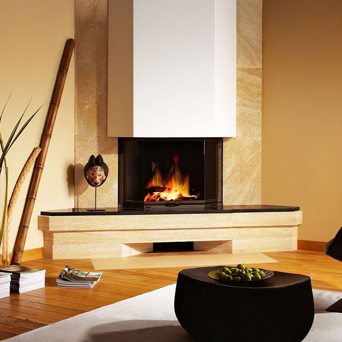 Угловой камин с мрамором Negro Marquina.