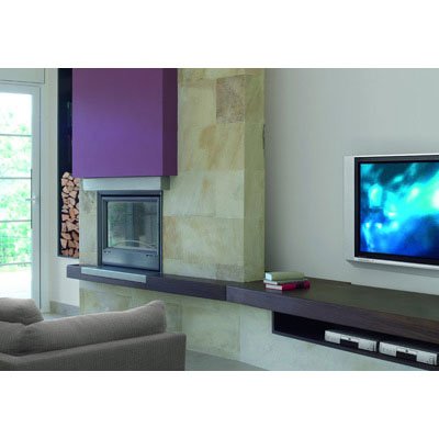Плоский фронтальный камин из кварцита Cuarcita (60х30 см), шпонированная плита Wengue. Изоляция и консоль из нержавеющей матовой стали. Вертикальный металлический дровник в черном цвете. Стандартный инсерт Panorama Clima.