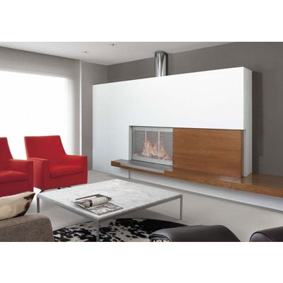Пристенный камин. Плита и фасад отделаны шпоном вишневого дерева. Горизонтально подвижный защитный экран модели Swing 90 Intro из матовой нержавеющей стали. Металлическая топка Class 90 с зольником и колосником.