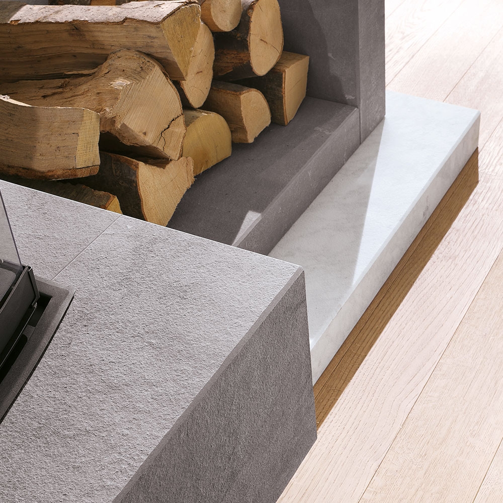 Облицовка создана специально, чтобы подчеркнуть оттенки трёхмерного обзора огня в 3-D топке. Исполненная из мрамора Bianco Carrara с эффектом старения, она имеет верх из обожженного камня Medea и мраморной дровницы