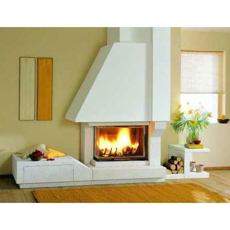 Пристенный каминный портал из белого камня с фактурой "тисненая кожа". С правой стороны от топки расположена тумбочка с выдвижным ящиком. Топочная дверца с прямым стеклом.