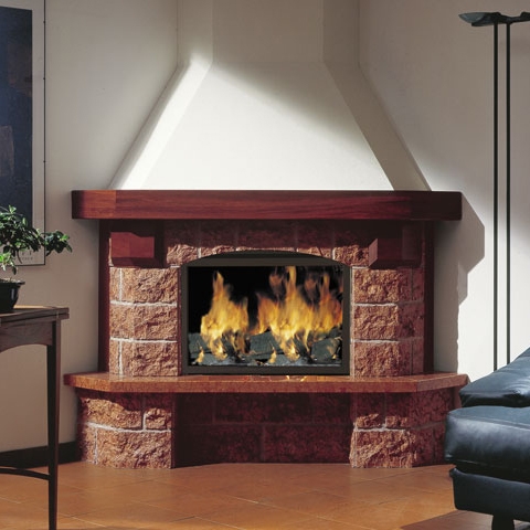 Традиционная облицовка из красного мрамора Асьго грубой обработки, плита из огнеупорных кирпичиков, деревянная балка.