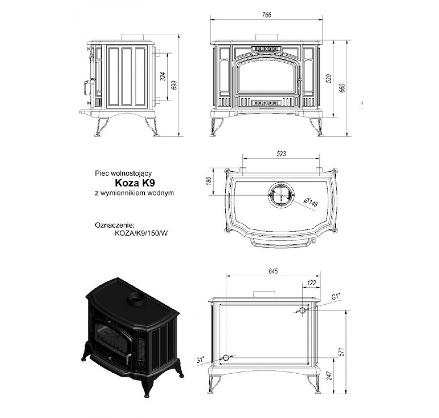 Печь-камин (буржуйка) Koza/K9/W c водяным контуром