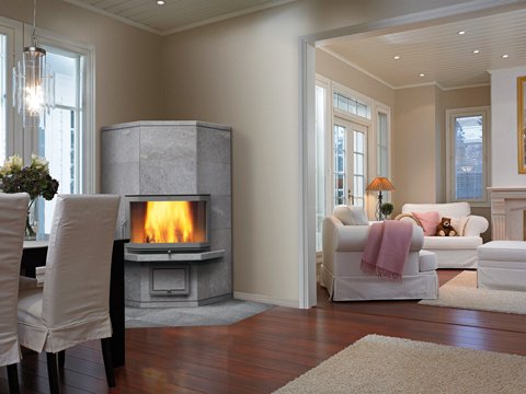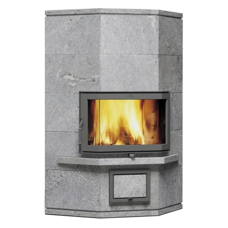 Угловой печь-камин с задним нижним подключением 2 теплового класса, для больших помещений.