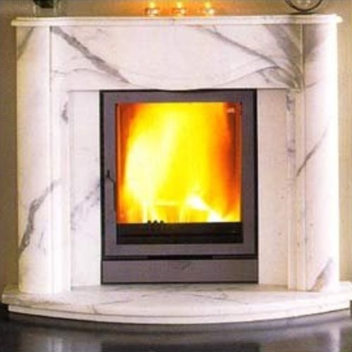 Выполнен из белого мрамора Bianco Statuario с черными полосами. Возможна адаптация к любой топке, а также использование в качестве электрокамина с электротопкой.
