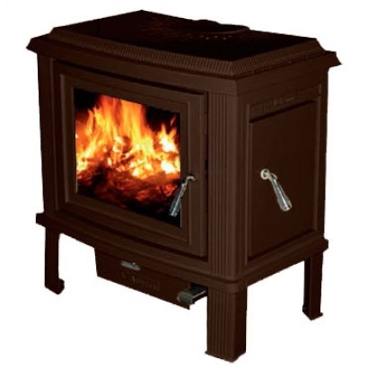 Печь с фронтальной и боковой дверцами, имеет систему Чистое стекло, ручка дверцы не нагревается в процессе топки. Печь покрыта эмалью, цвет - коричневый.
