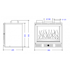 Стальная каминная топка с прямым стеклом. Боковое открывание двери. Ширина дверки 621 мм. Высота дверки 548 мм. Возможно подключение воздуха извне.