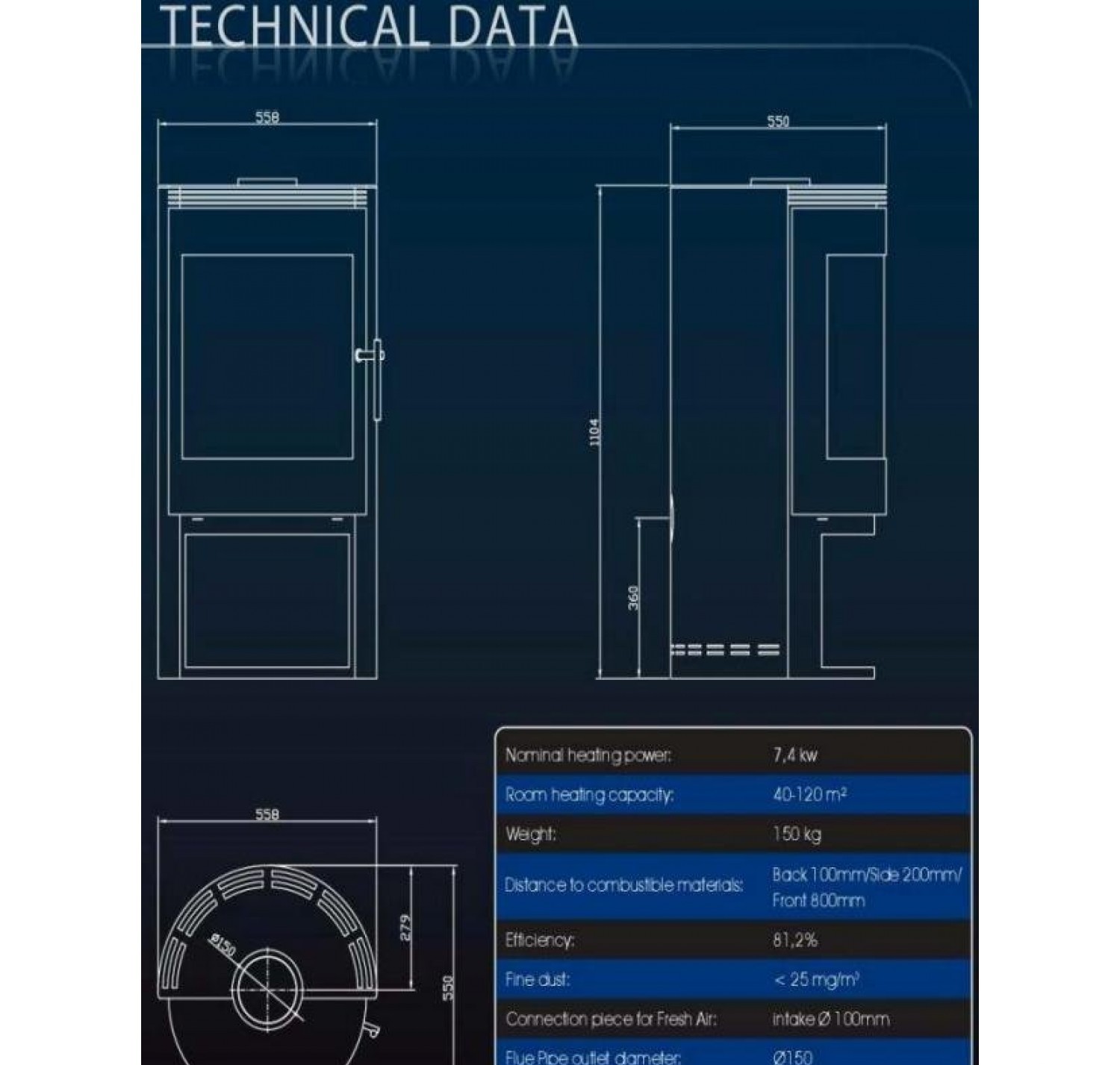 - Диаметр дымохода, (мм) 150 мм.