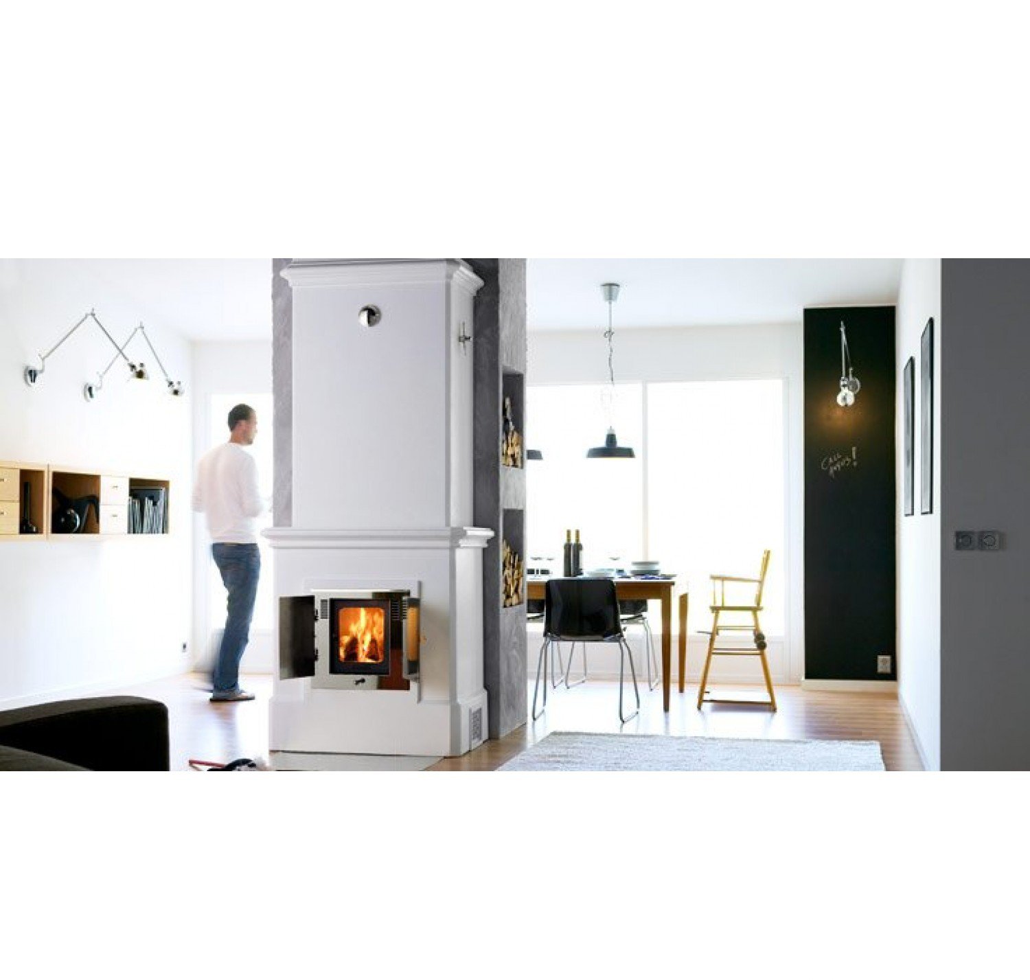 Коэффициент полезного действия, или доля используемой энергии по отношению к полученной при сгорании дров энергии, составляет целых 87%. Печи оборудуются уникальной секцией горячего воздуха с выводом тепла на фронтальную сторону печи, что ускоряет нагрев помещения. Секция горячего воздуха может дополняться вентилятором, который равномерно распределяет тепло по помещениям. В доме с принудительной вентиляцией рекомендуется подключать канал подвода воздуха снаружи напрямую к печи.