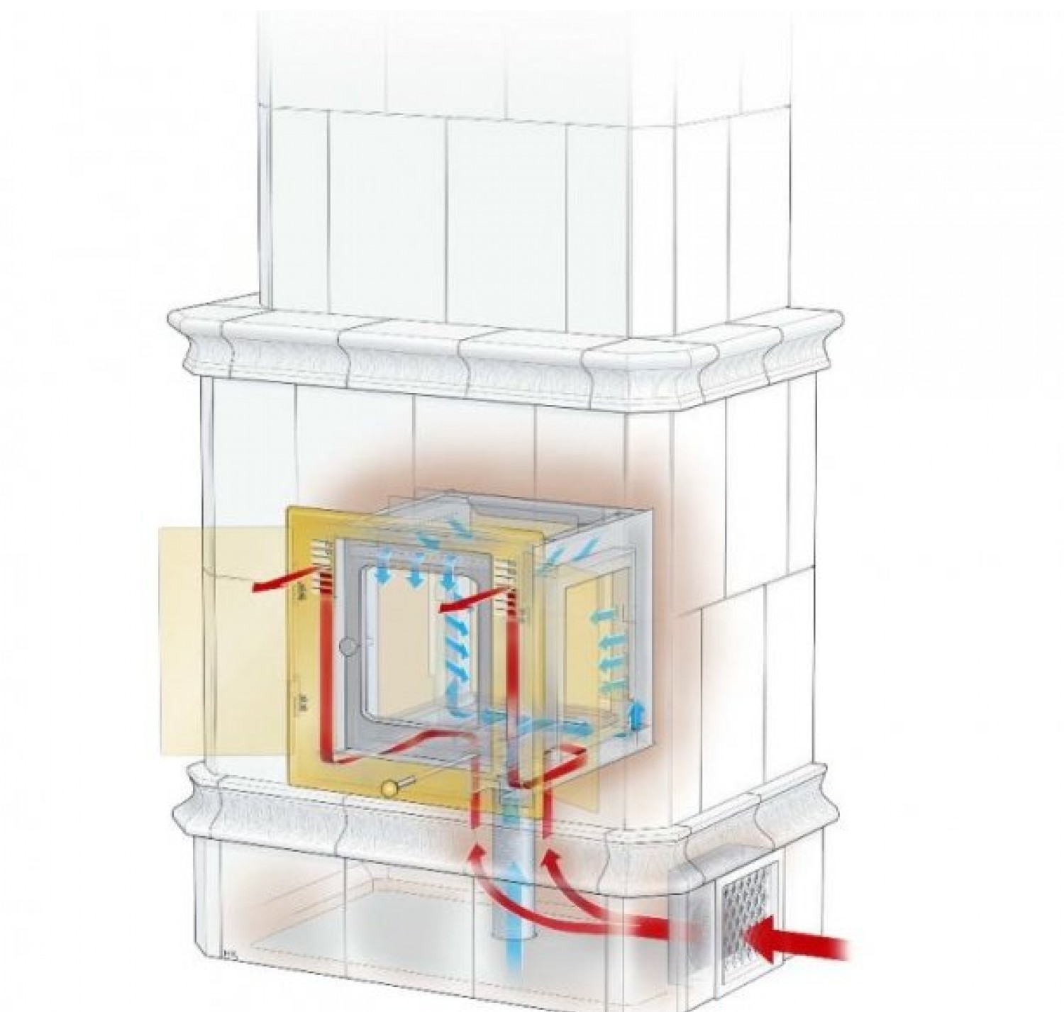 Печи оборудуются уникальной секцией горячего воздуха с выводом тепла на фронтальную сторону печи, что ускоряет нагрев помещения. Секция горячего воздуха может дополняться вентилятором, который равномерно распределяет тепло по помещениям. В доме с принудительной вентиляцией рекомендуется подключать канал подвода воздуха снаружи напрямую к печи.