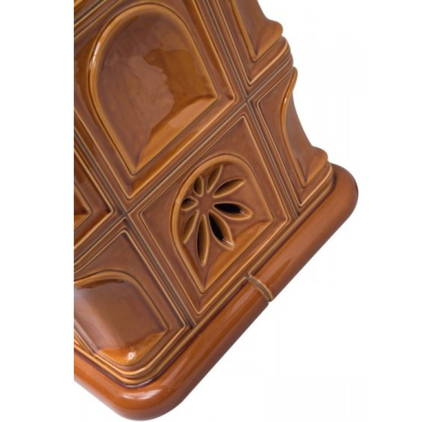 С помощью изразцового декора Ваш дом преобразится до неузнаваемости и станет настоящим произведением искусства. Большие керамические блоки, которые используются в облицовке данной модели также несут функцию теплонакопительных модулей (аккумуляция), которые позволяют излучать тепло в течении нескольких часов после того как огонь погаснет. Данная модель отлично подходит для отопления любого помещения, объем которого не превышает 220 м3. Застеклённая дверца повышает визуальный контакт с пылающим огнем. Керамическая облицовка оригинальна, но вместе с тем, сдержанно элегантна. Аккуратно сделаны и обработаны мельчайшие элементы, углы, плавные линии.