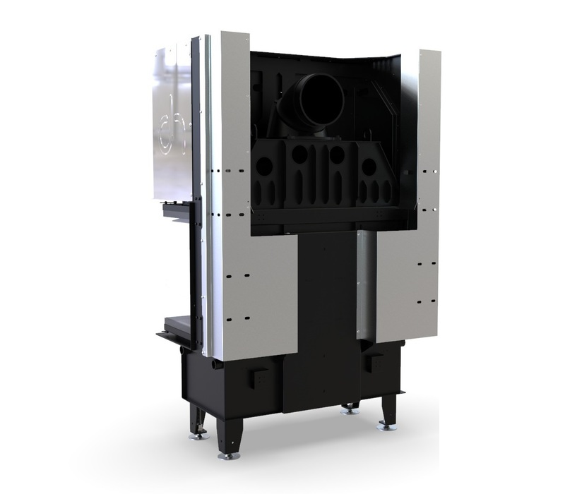 Трехсторонняя модель позволяет добиться максимального обзора огня в пристенном камине, создавая ультрасовременный интерьер. Камин оборудован закаленным стеклом, что способно выдержать температуру до 800 °С. Изделие изготовлено из высококачественной стали, имеет эффективность нагрева 80,1 % и отапливает помещения площадью 55-185 м². Экологически безопасная вставка обладает высокой энергоэффективностью ― класс A.