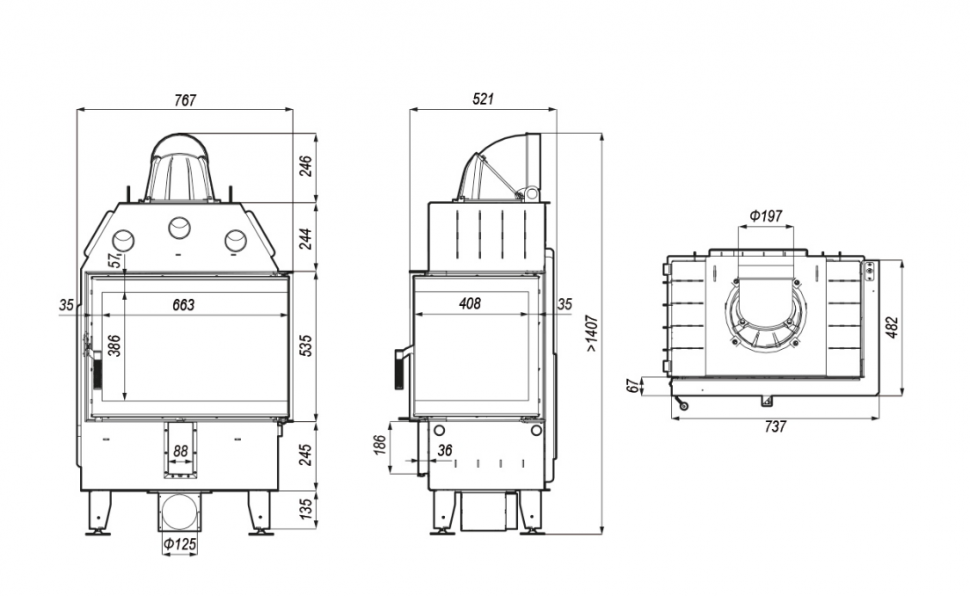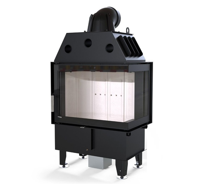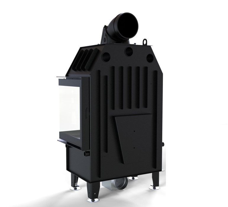 Модель изготовлена из стали с порошковым покрытием. Устройство с центральной подачей воздуха снаружи и возможностью ее регулировки. Специальная конструкция на трубе для подачи воздуха в топку, дает возможность изменить направление подачи воздуха на боковое. Плотно размещенные радиаторы способствуют передачи больше тепла окружающей среде, а воздуховоды повышают эффективность камина.