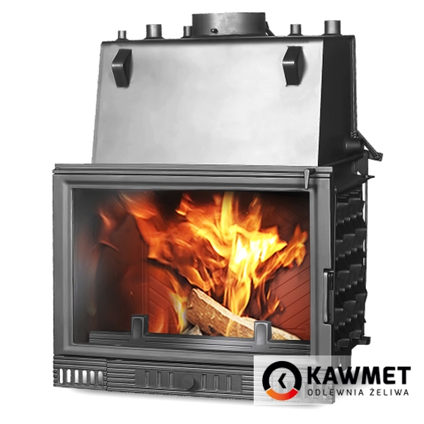 Каминная топка с водяной рубашкой Kaw-Met W1 CO 18.7 кВт представляет собой топку W1 мощностью в режиме конвекции 10,8 кВт с установленным в верхней части топки водонаполненным теплообменником мощностью 7,9 кВт, такие отличные характеристики позволяют отапливать частный дом или административное здание площадью до 190 м.кв., а учитывая великолепную цену топки и топлива получить не только качественный дизайнерский отопительный прибор, а также красивый предмет интерьера с живым огнём.