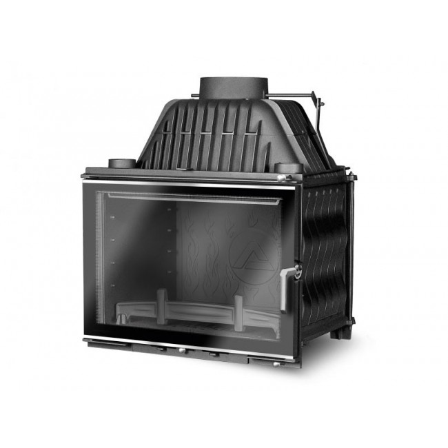 Повышенный КПД и теплоотдачу обеспечивает чугунный дефлектор, который расположен над камерой сгорания каминной топки KAWMET. Назначение дефлектора - направить недогоревшие частицы дровяного газа в центральную часть камеры сгорания, где происходит повторное догорание. Также дефлектор увеличивает тепловую эффективность топки путем удлинения пути прохождения продуктов сгорания.