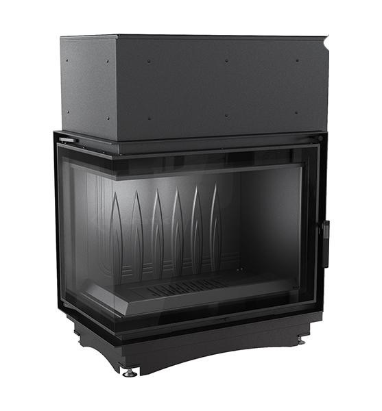 - Угловая топка с цельным Г-образным стеклом. Дверца топки распашная.