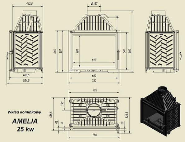 Каминная топка Kratki Amelia – топочная камера или топка-вкладыш, предназначенная для отопления дома площадью до 250 кв.м. Топка серии Amelia имеет прямое стекло и стандартное боковое открытие дверцы. Дровяные топки Amelia имеют высокий КПД, который обеспечивают система двойного дожига и ребра по сему корпусу топки, повышающие ее тепловые характеристики.