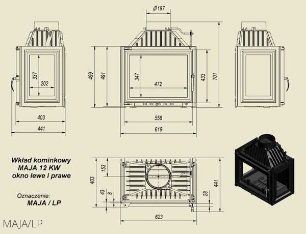 Топка для камина непрерывного сгорания серии Maja/LP(стекло слева-справа) – надежный отопительный прибор от польской компании Kratki. Серия каминных топок Maja LP – это отопительные приборы высокой надежности, которые работают на дровах.