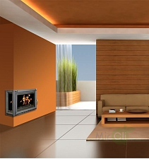 - Декоративная стеклянная панель типа glass, что выдерживает температуру до 800 °C и предоставляет камину современный и элегантный вид, оптически увеличивает переднюю часть топки.
