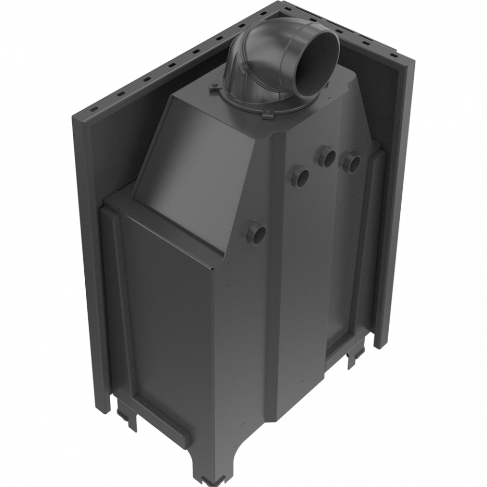 - Высокий переход из камина в дымоход и размещены поперек водяные дефлекторы увеличивают поверхность теплообмена между топкой и окружающей средой. Понижение температуры дымовых газов приводит к увеличению мощности устройства.