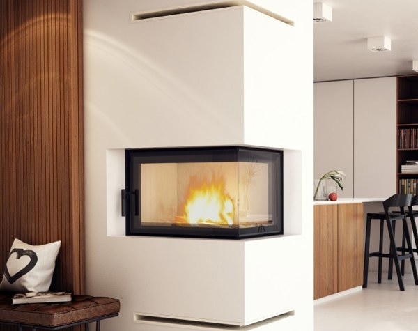 • Каминная топка с двумя стеклянными панелями, сопоставленными друг напротив друга под прямым углом (стеклянные панели соединены без рамы).