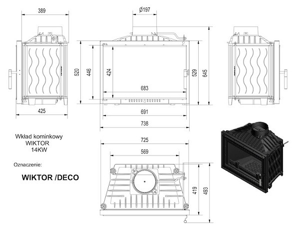Wiktor/Deco – серия чугунных топок от Kratki мощностью 14 кВт. Отличительная особенность – в базовой комплектации оснащена декоративной дверцей с нанесением покраски на стекло методом шелкографии, что придает камину современный внешний вид, оптически увеличивая поверхность стекла.