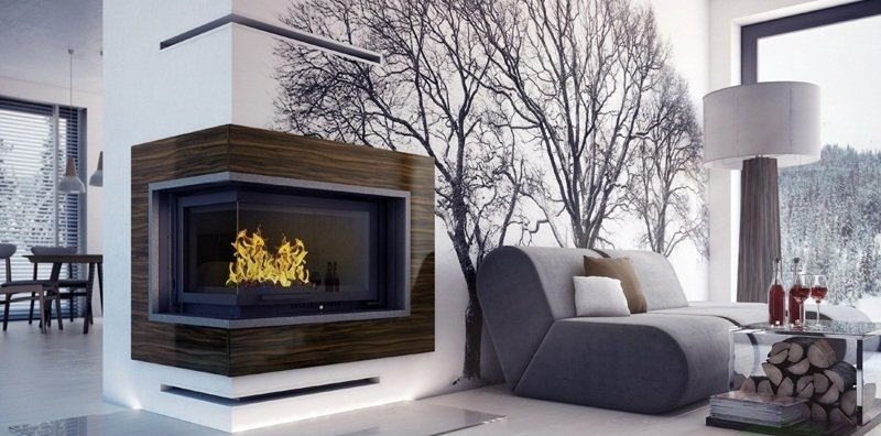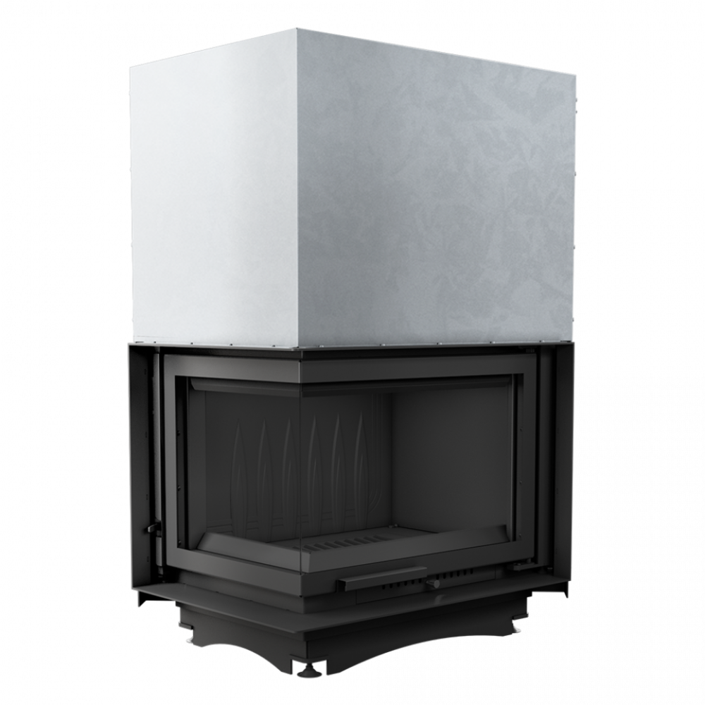 • Каминная топка с двумя стеклянными панелями, сопоставленными друг напротив друга под прямым углом (стеклянные панели соединены без рамы).