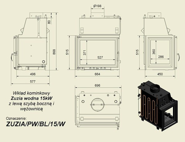 Каминная топка Kratki Zuzia/PW/BL/15/W (стекло слева, змеевик) — это топка небольшой мощности со встроенным теплообменником, дополнительным остекленеем с левой стороны и змеевиком. Данную топку можно размещать в каминах углового типа – остекление с двух сторон позволяет прекрасно видеть огонь с нескольких сторон.