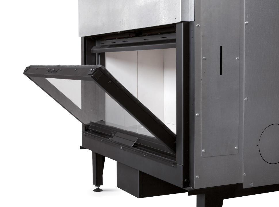 - Система очистки стекла — представляет собой специальный канал-воздуховод над дверцей топочной камеры, куда подается дополнительная порция кислорода, за счёт которой происходит сгорание частиц топлива на поверхности стекла и оно остаётся чистым.
