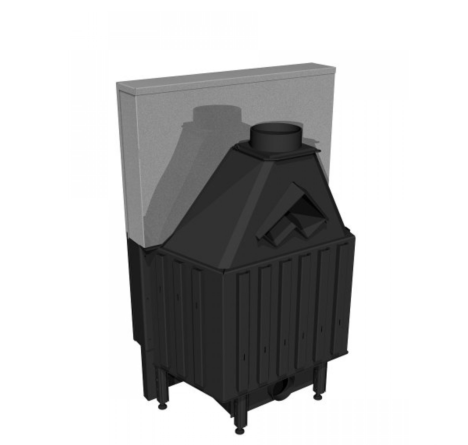 Корпус каминной топки выполнен из жаропрочной стали, колосники и патрубки из чугуна.