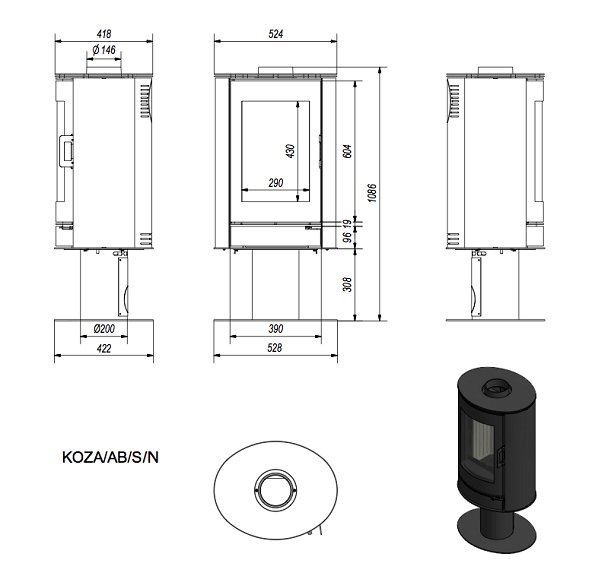Печь Koza AB/S/N современной цилиндрической формы. Камера сгорания, корпус печи, верхняя плита и дверца изготовлены из стали. Печь имеет верхнее или заднее подключение к дымоходу. Камера сгорания футерована керамикой Acumotte. Дверца с большим панорамным стеклом. Камера под печкой оснащена механизмом «нажмите для открытия» - открывается нажатием. Тройная система подачи воздуха в камеру сгорания: первичный и вторичный воздух, а также воздух, который подаётся на стекло (система чистого стекла). Вся продукция компании Kratki.pl соответствует стандартам BImSchV 2, что гарантирует высокое качество продукции.