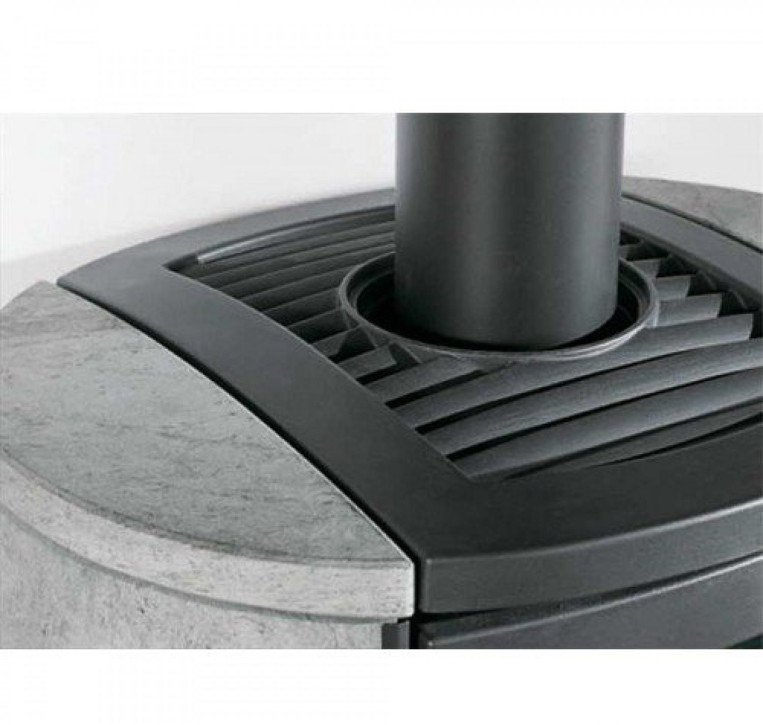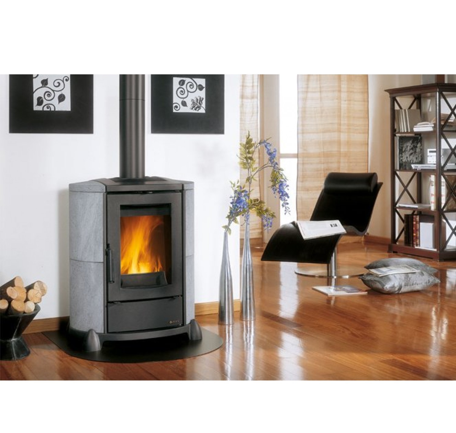 Чугунная дверца с плоским стеклом, выдерживающим нагрев до 750°С. Облицовка боковых частей стеатитом. Верх и основание печи выполнены из чугуна. Быстрый обогрев помещения объемом до 186 м? (номинальная мощность — 6,5 кВт). Регулятор поступления вторичного воздуха для оптимизации температуры внутри топки при горении. Удобный выдвижной зольный ящик.
