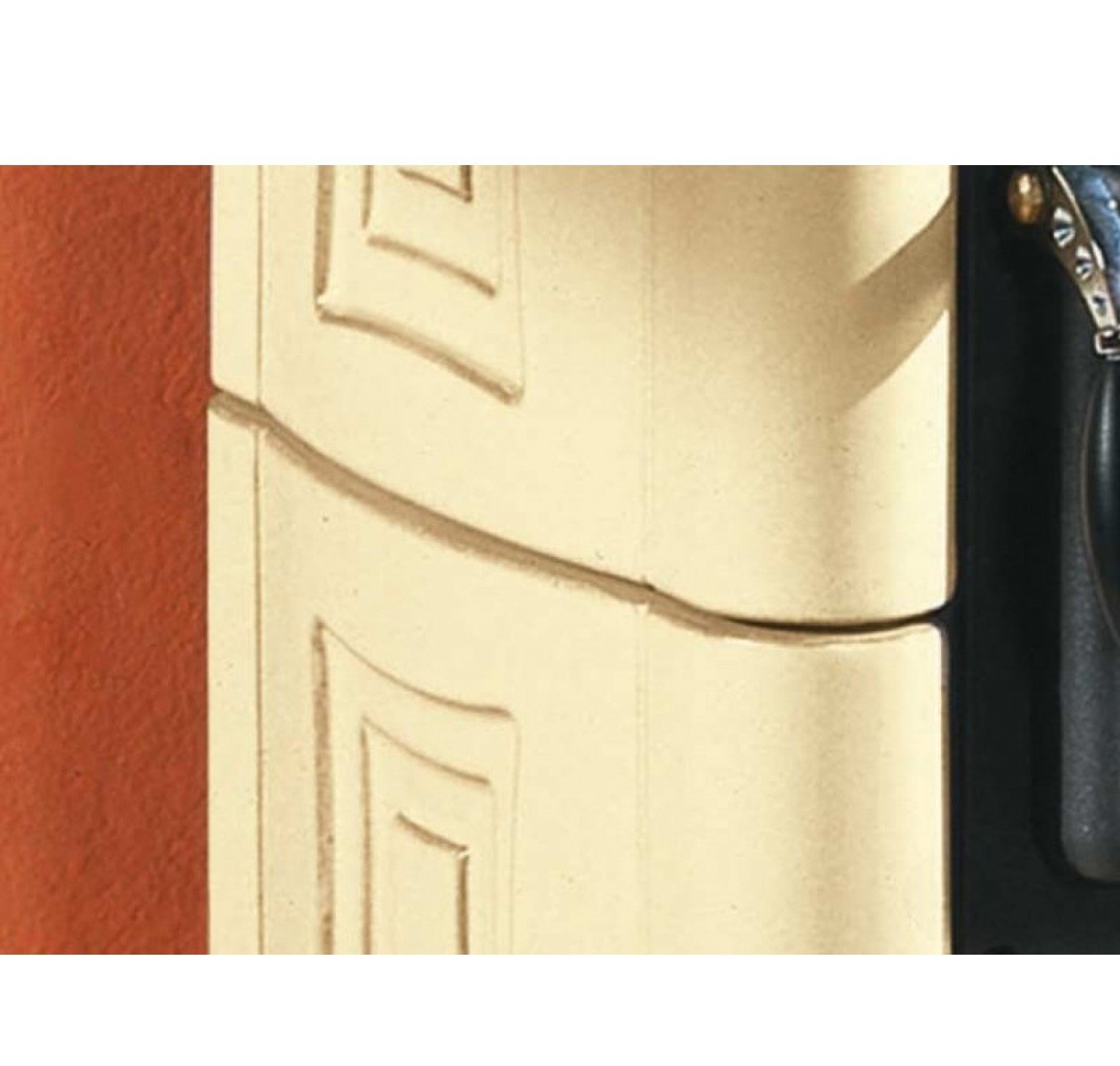 К достоинствам камина относится высокая мощность, хорошая технологическая оснащенность и красивый внешний вид. Камин работает на сухих дровах и имеет встроенные системы управления вторичным и третичным воздухом, позволяющим повысить тепловую эффективность печи до 79,8%. Основные элементы модели выполнены из литого чугуна. Конструктивно печь состоит из трех функциональных частей: топочной камеры, вместительного духового шкафа и зольника. Топка и духовка имеют дверцы с большими окнами из термоустойчивого стеклокерамического материала, способного выдержать жар в 750 градусов Цельсия. Благодаря обдуву внутренней поверхности окон горячим вторичным воздухом (система «чистое стекло»), продукты горения не оседают на их поверхности. Внешняя облицовка печи изготовлена из майолики (капуччино, бургундия, пергамент) эксклюзивной ручной формовки.