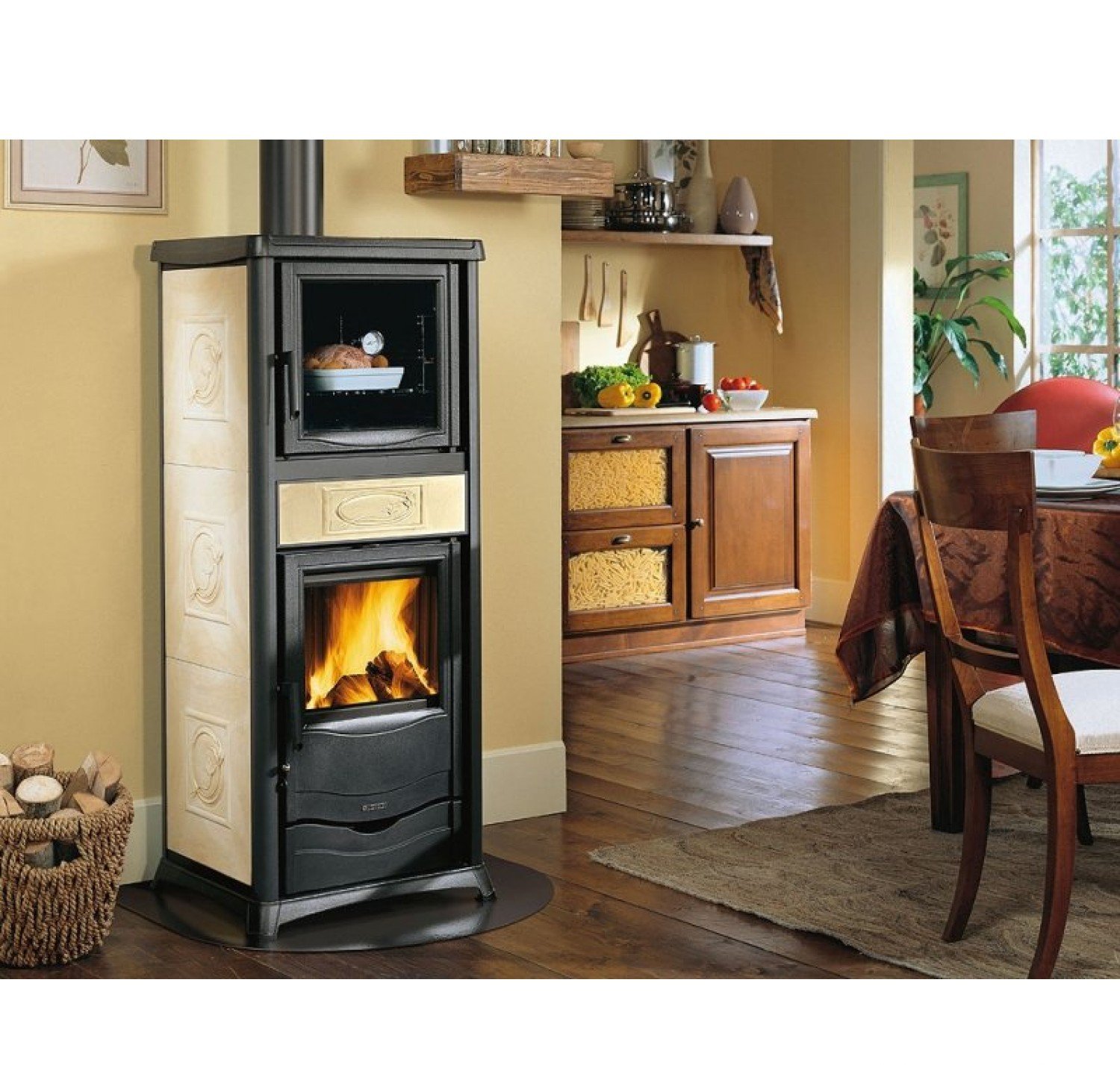 Данная модель способна обеспечить тепло помещения, объем которых составляет 260 м. куб. КПД топки может достичь 86%. Отопительный прибор данной модели имеет удобные стеклянные дверцы, и в духовке, и в топке. Для их изготовления была использована термостойкая стеклокерамика высокого качества, которая способна удерживать температуру в 750 градусов по Цельсию. Печь-камин модели Rossella Plus Forno EVO оснащена камерой двойного сгорания, где перерабатываются вредные летучие газы, образовавшиеся в процессе горения. Также печь-камин данной модели оснащена вместительным зольным ящиком и дровяным ящиком в нижней части. В верхней части печи-камина имеется специальный выход для подключения дымохода.