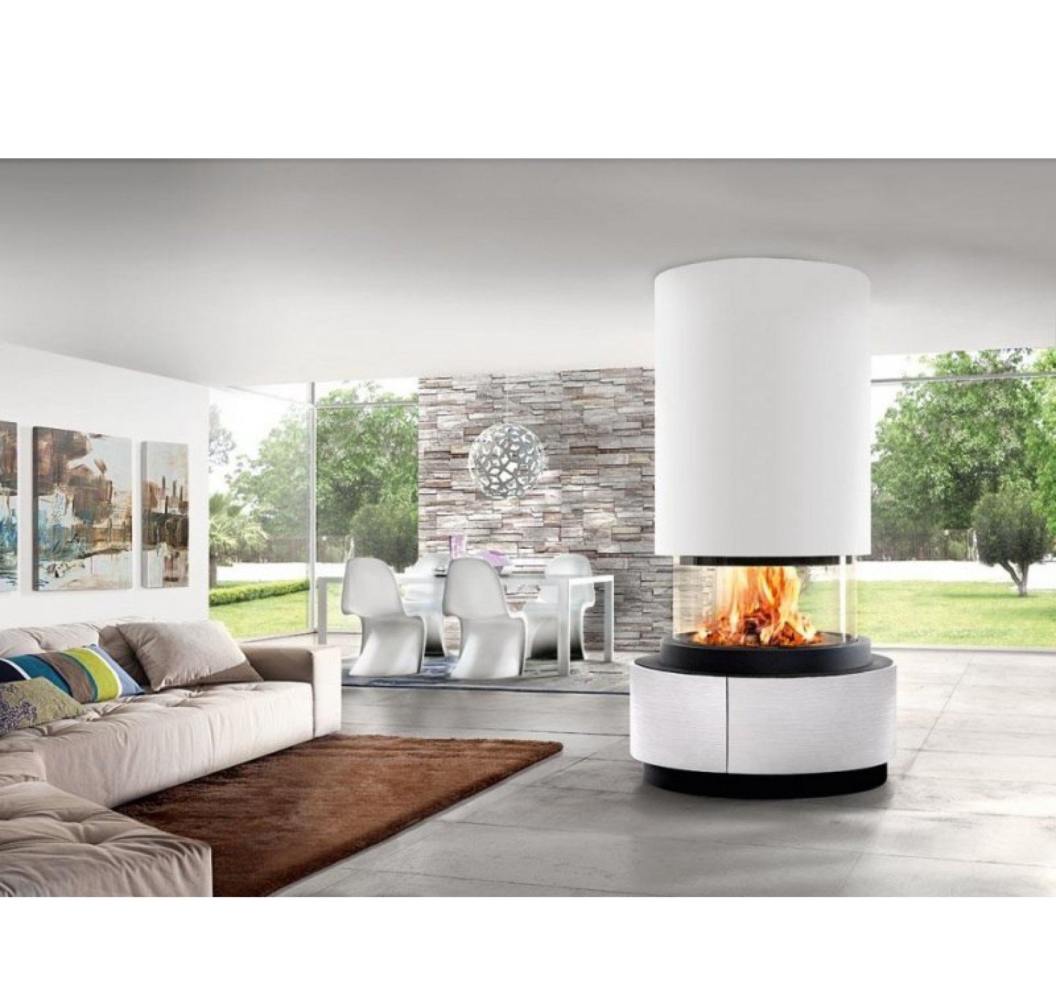 Камин со стальной опорой от итальянской компании Piazzetta подарит вам много интересных решений для вашего дома, так как Коллекция Panoramic – это модели современного характера, которые обладают необычайно привлекательными внешними данными, а также смотрятся великолепно и необычно в подходящем, стильно оформленном интерьере. Камин Oslo – это модель, которая отличается необычайно выгодными очертаниями. Она имеет центральное расположение кругообразной формы. Топка закрыта стеклом, и яркое пламя вы сможете увидеть также в круговой форме – полноценный просмотр пламени вам обеспечен. Его можно будет увидеть из любой точки комнаты. Камин сделан из высоколегированной стали и устанавливается на практичную стальную опору, покрытую серебристой эмалью. Остальная стальная поверхность покрыта черной эмалью. Топка в камине – это особенно красивое зрелище. Закрытая стеклянной жаропрочной поверхностью, такая топка сможет стать бесценным источником полноценного обогрева. Благодаря широкому формату топки, она сможет стать необычайно стильно оформленным средством обогрева, а также принять в себя большое количество дровяного топлива. Топа оснащена электронным механизмом – это еще одна современная разработка от мастеров из Италии Piazzetta – это спуск и подъем всей поверхности стекла. То есть ваш камин может быть как с открытой топкой, так и с закрытой. Это очень удачная разработка от мастеров, так как вам предоставляется выбор. Или ваш камин будет на максимально близком расстоянии предоставлять вам яркое живое пламя, или топка в камине будет закрыта и максимально безопасна в противопожарном плане. Тем самым, вам представится очень удачный выбор в плане обогрева дома. Ведь закрытая топка способна гораздо лучше обогреть дом, чем открытая, где горение сопровождается смешиванием со свежим воздухом.
