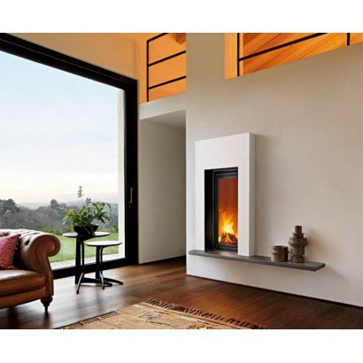 Стальная рамка с отделкой из черной эмали (на фотографии изображена модель из майолики Bianco Antico вместе с банкеткой, высокая дровяная топка МА 266 SL).