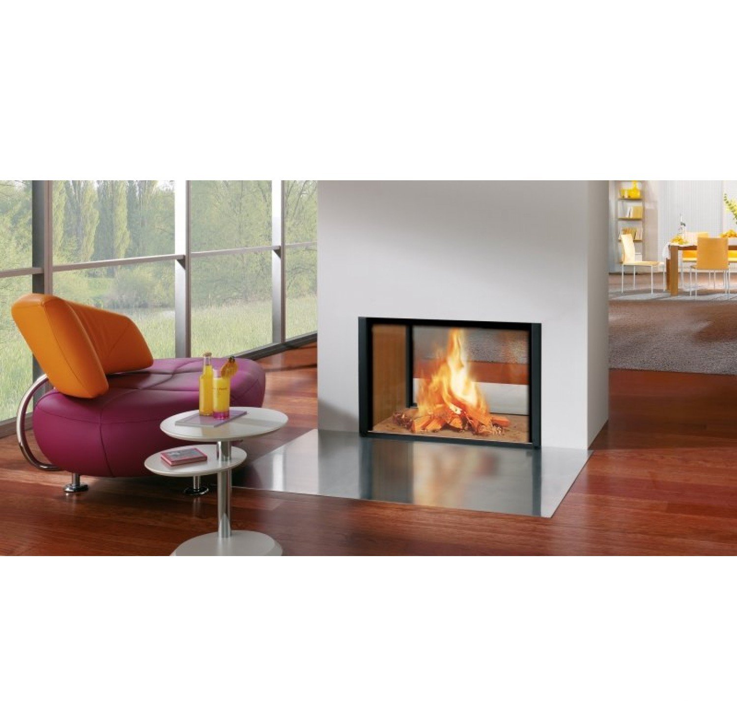 Внушительные размеры каминной топки позволяют расположить ее в интерьере большого помещения.Наличие двух противоположных стеклянных фасадов предоставляет возможность для использования этой топки в зональном делении помещения.
