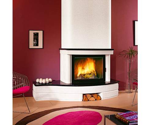 Пристенный камин из золотисто-песочного или белого Эдельрока. Декорирован черным мрамором Маркина или кремовым Марфил. Камин оснащен элементами, позволяющими установить открытую или закрытую дровницу.
