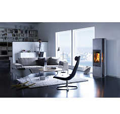 Дверь топки полностью поднимается вверх, тем самым не мешая обзору пламени. Для чистки стекла дверь откидывается вперед. Дымоход контролируется шибером, регулирующим тягу. Регулировка подачи воздуха на горение осуществляется через колосниковую решетку.