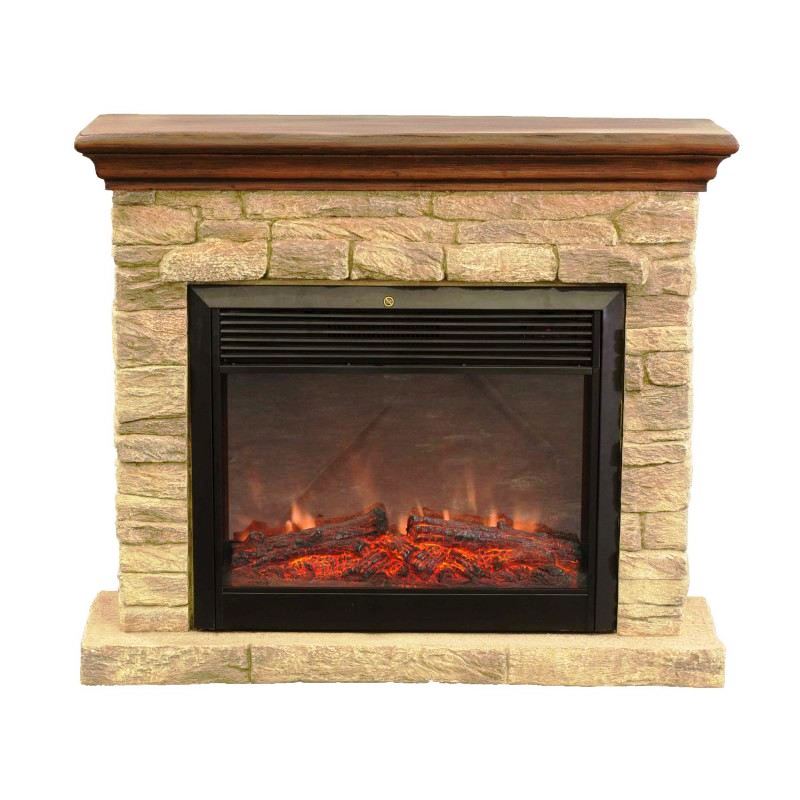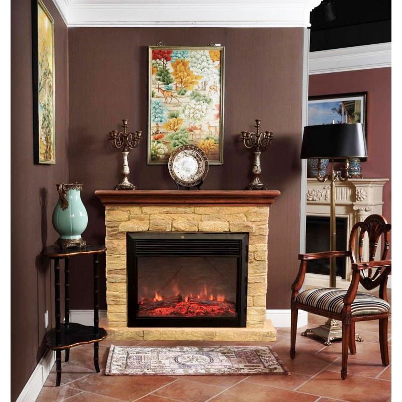 - Основной корпус очага изготовлен из металла в черном цвете с имитацией кирпичной кладки, портал из полистоуна (искусственный камень). Сверху имеет деревянную полочку - его выгодное отличие от похожих моделей.