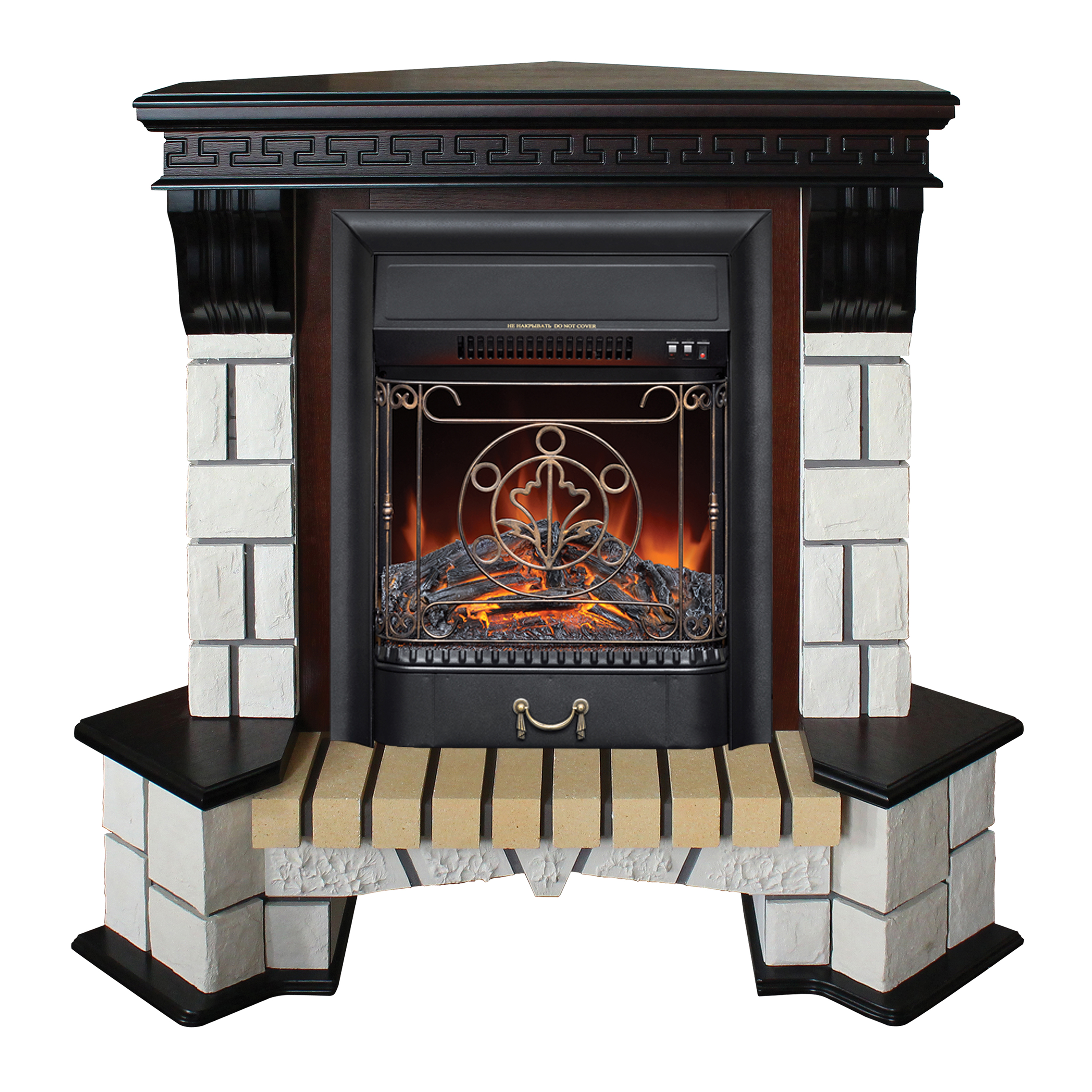 Угловой каменный каминокомплект RealFlame Stone Corner AO очаг Majestic Lux BL S изготовлен из из искусственного камня и шпонированного МДФ. Очаг с открытым муляжом выполнен в точной копии тлеющих углей и небольших поленьев. Оригинальности и схожести с натуральным камином добавляет ажурная кованая решетка и звук потрескивания дров.