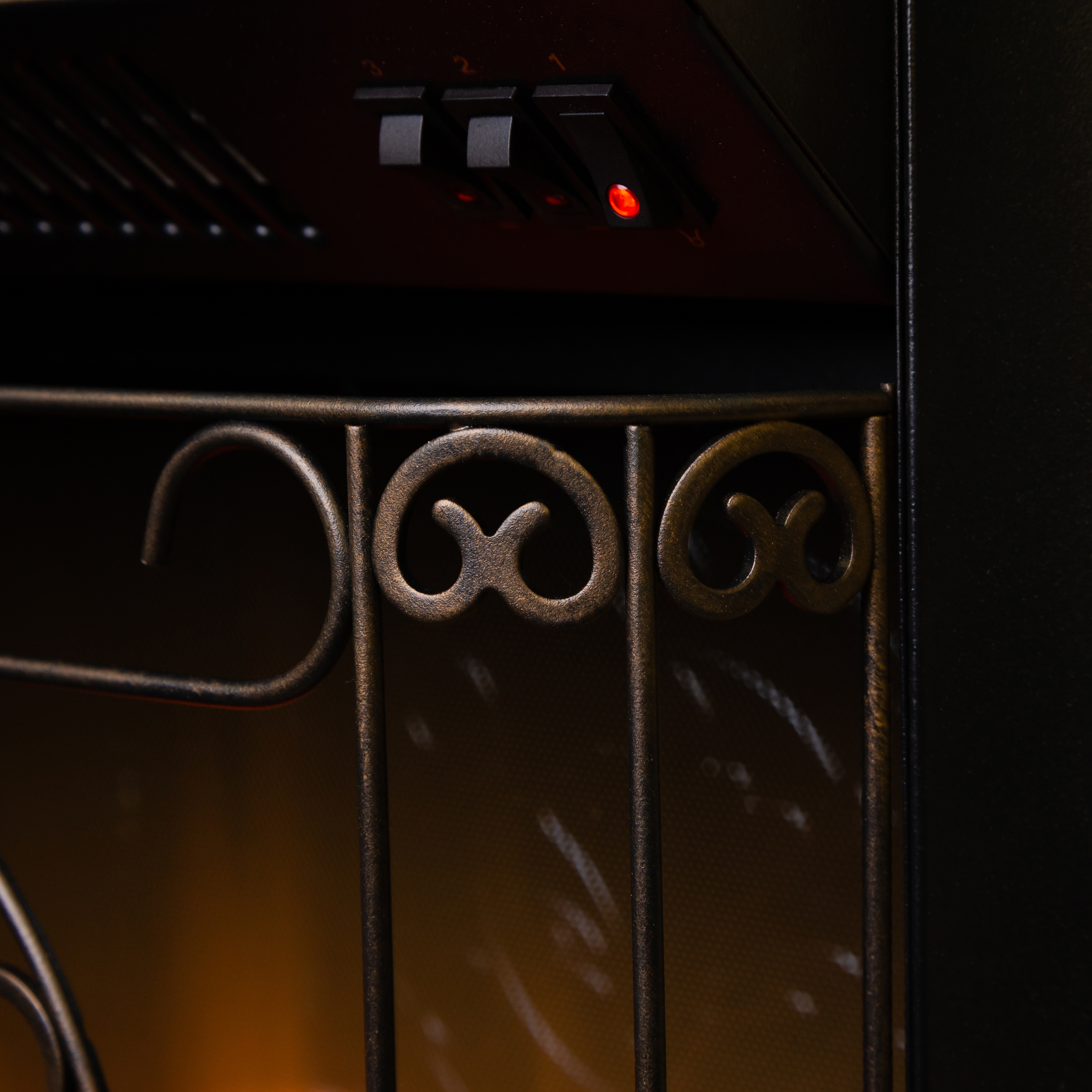 Переключатель позволяет использовать два уровня мощности. В режиме визуализации пламени потребление электроэнергии составляет 80 Вт (две свечеобразные лампы E14 мощностью 40W).