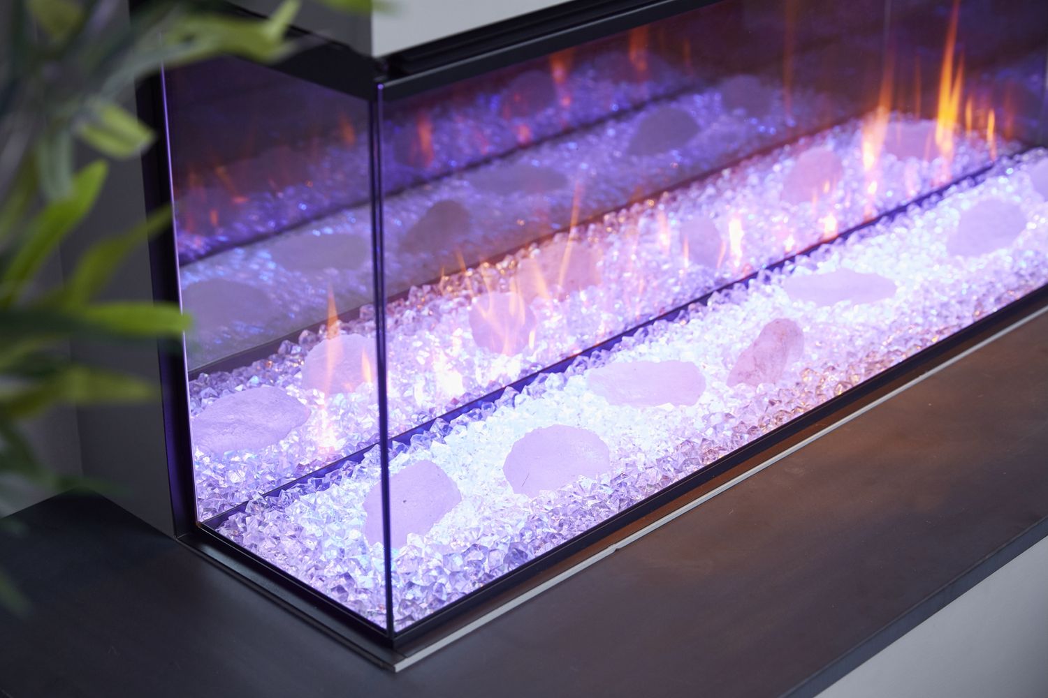 - Функция верхней подсветки: Освещает декоративные элементы (дрова и кристаллы), создавая отражение на задней зеркальной стенке, что усиливает визуальную глубину топки.