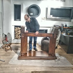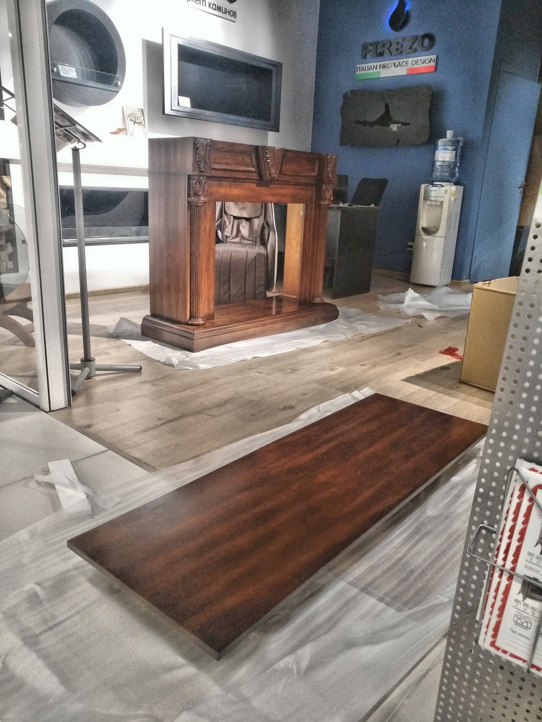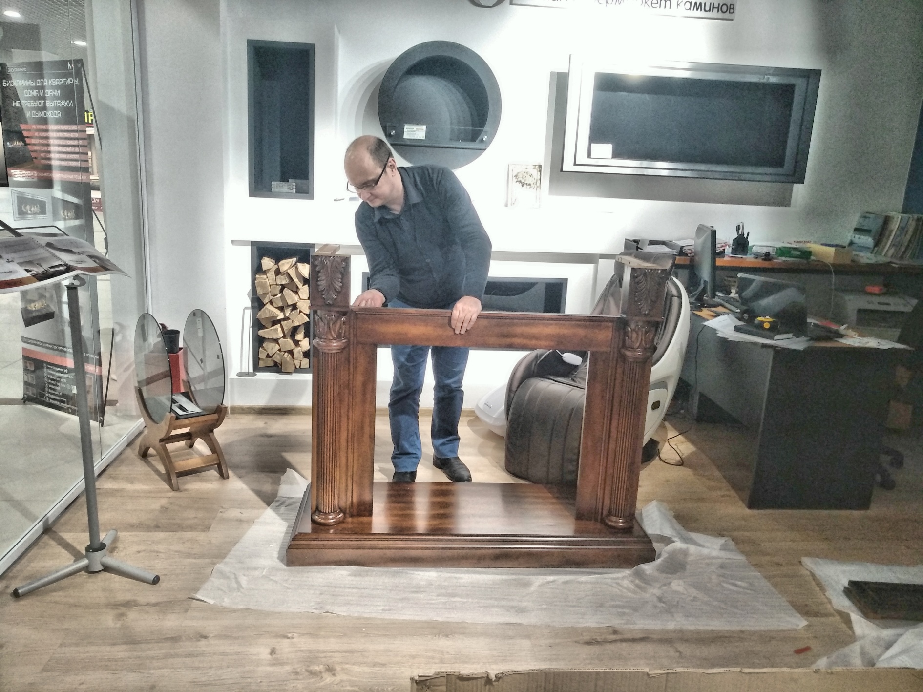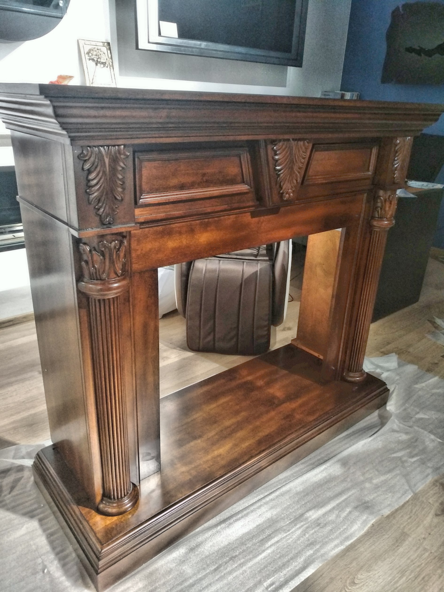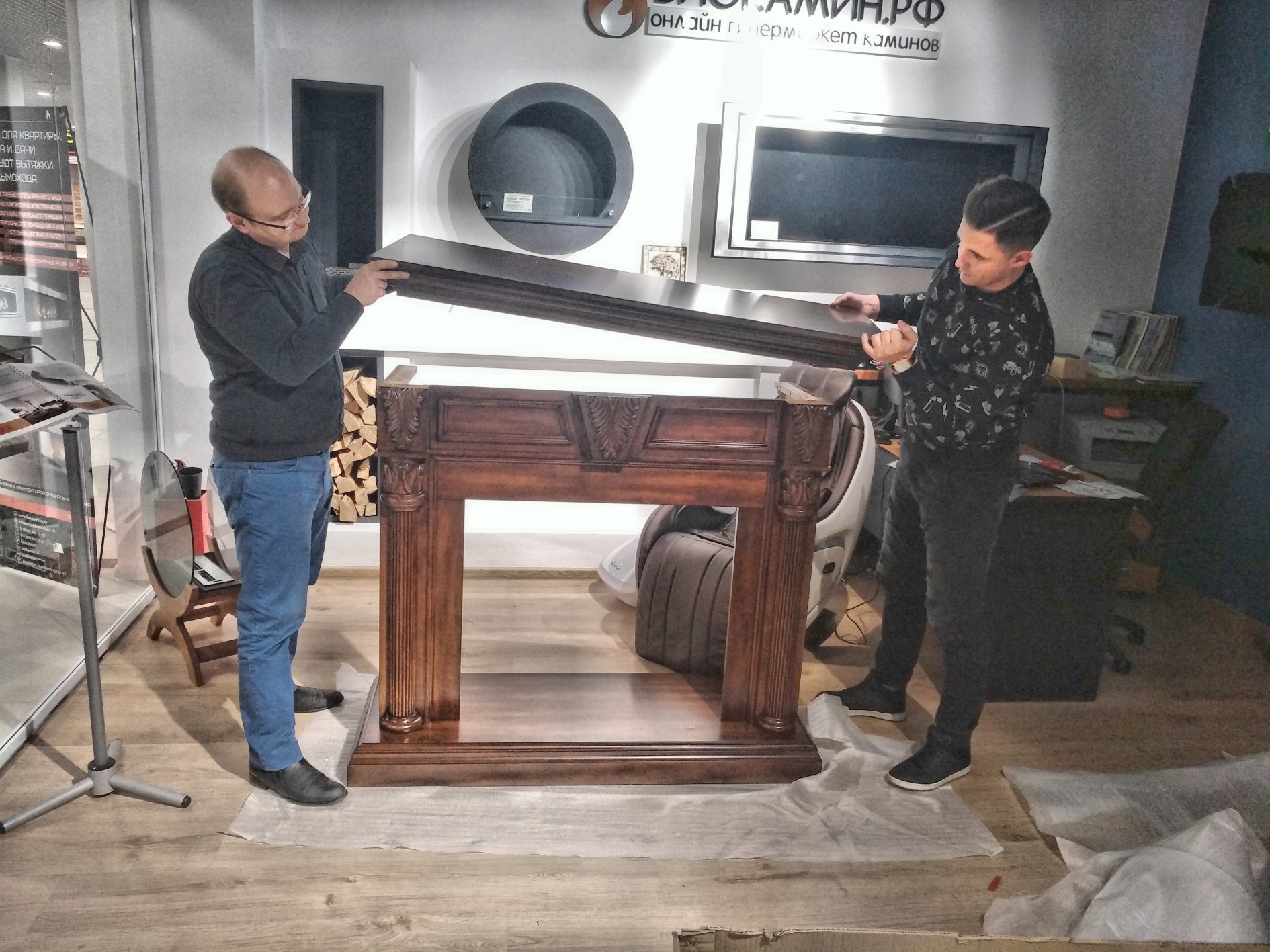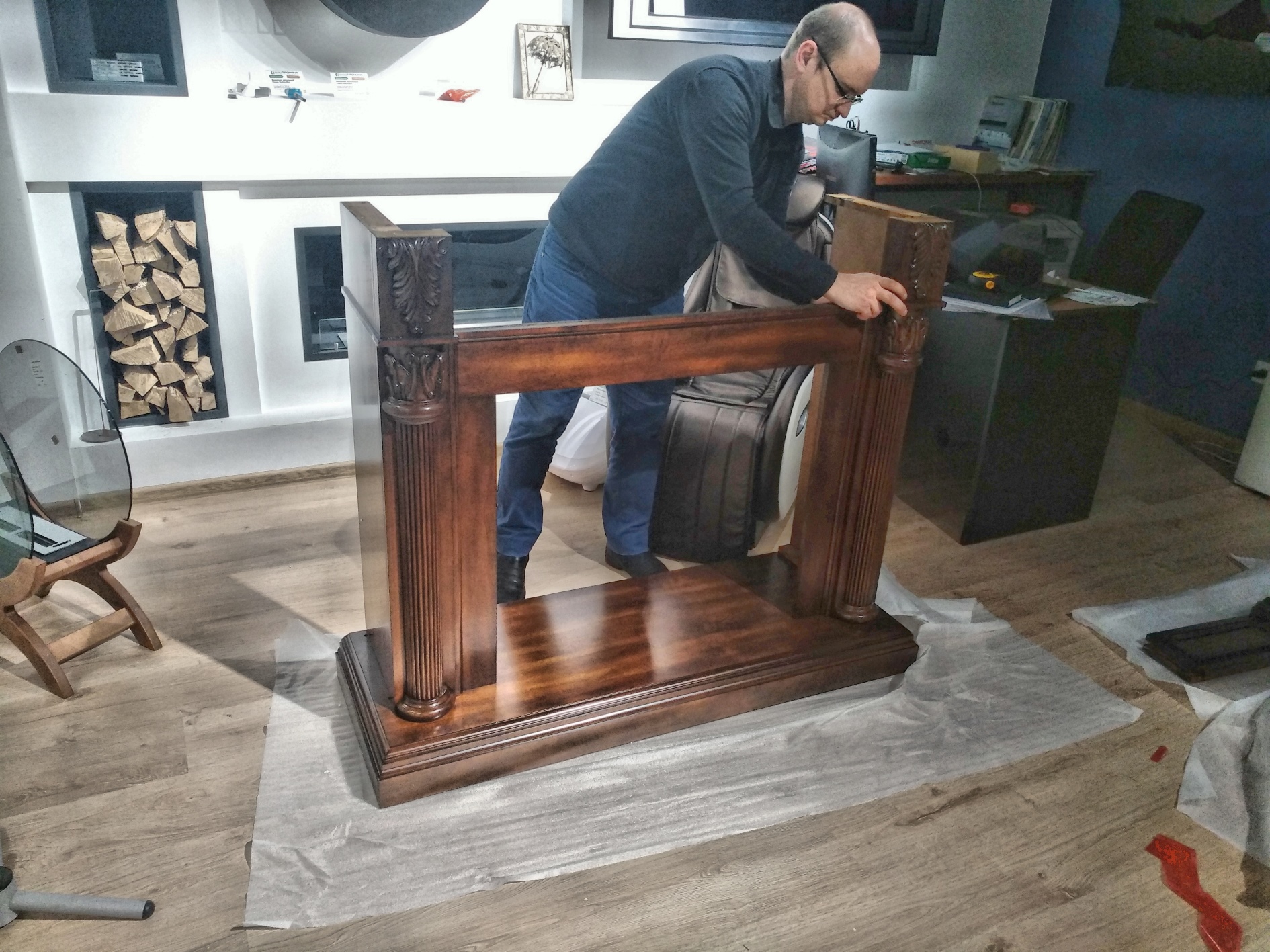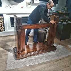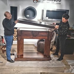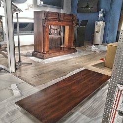 Мы привези, распоковали, собрали за 15 минут (Портал приходит в разобранном виде. Это очень удобно для транспортировки.) и установили шикарный портал Sheffield из МДФ и натурального шпона цвета грецкий орех.
